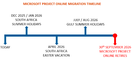 Project Online will continue to function until September 30, 2026 – but planning and decision making is critical, and organizations are advised to be migrated prior to this date considering holiday schedules / downtime across the MEA region shortens the timelines available for migration to less than 8 months counting, from publishing this article.  Project Online data will not be accessible from 1st October 2026.